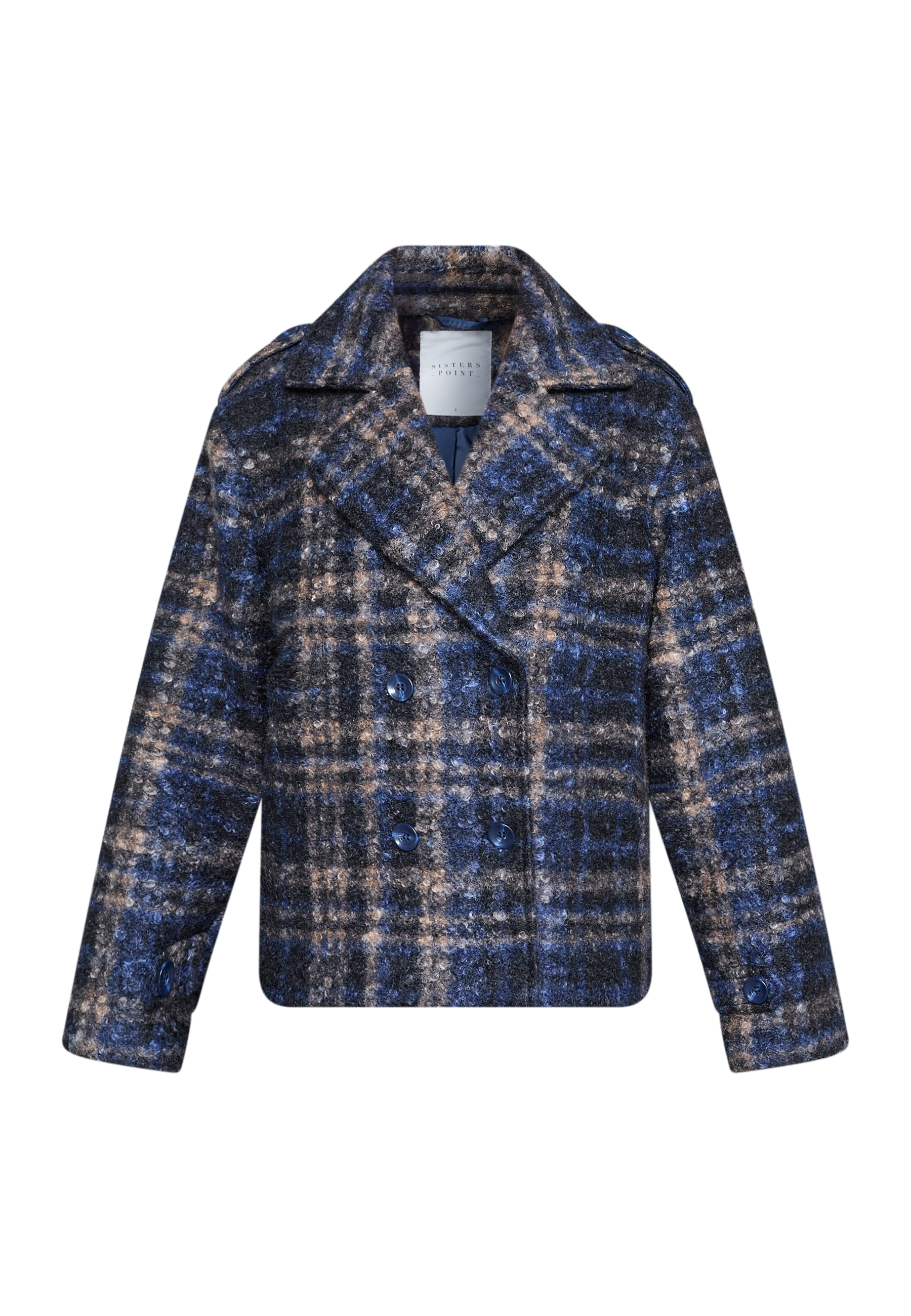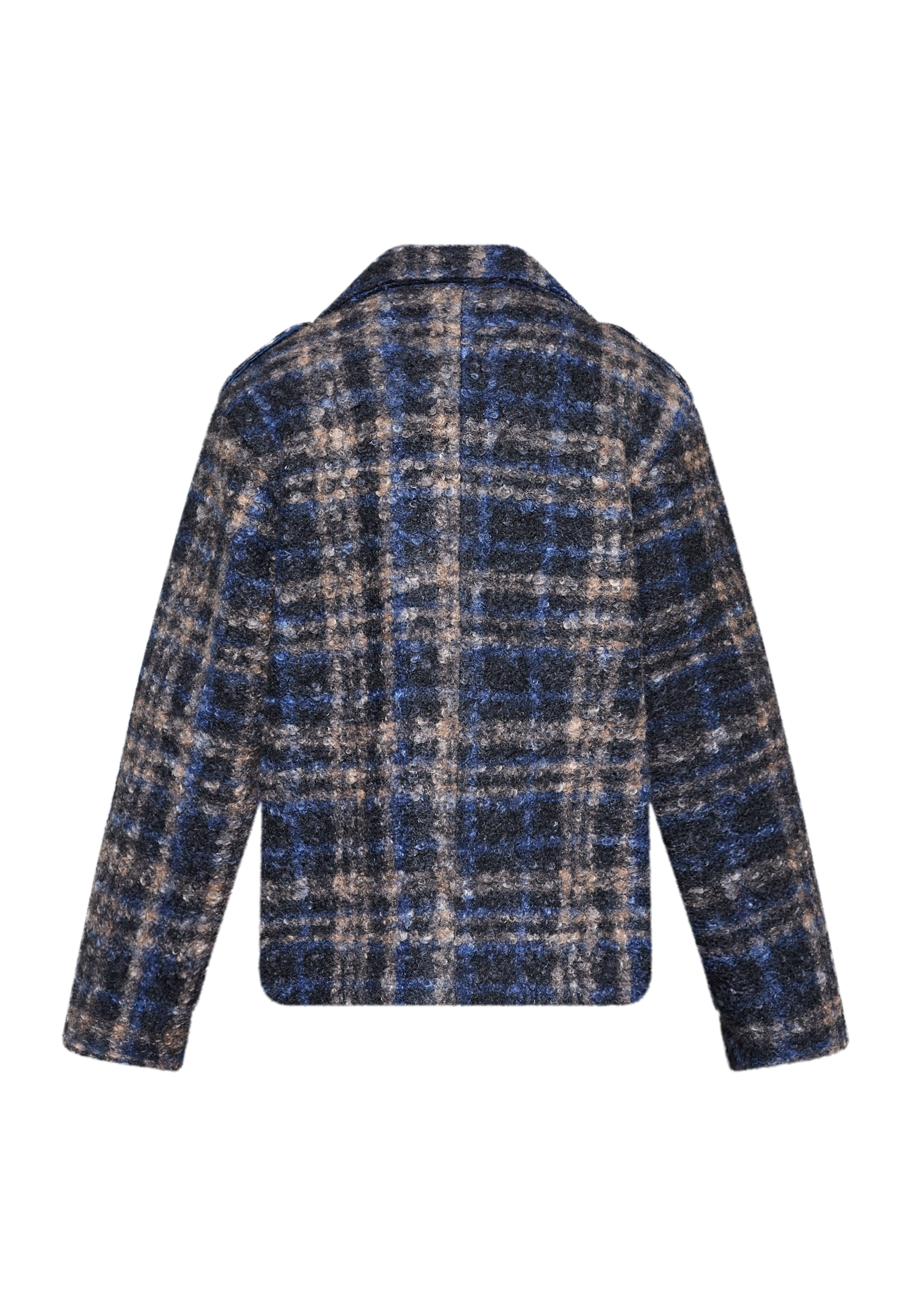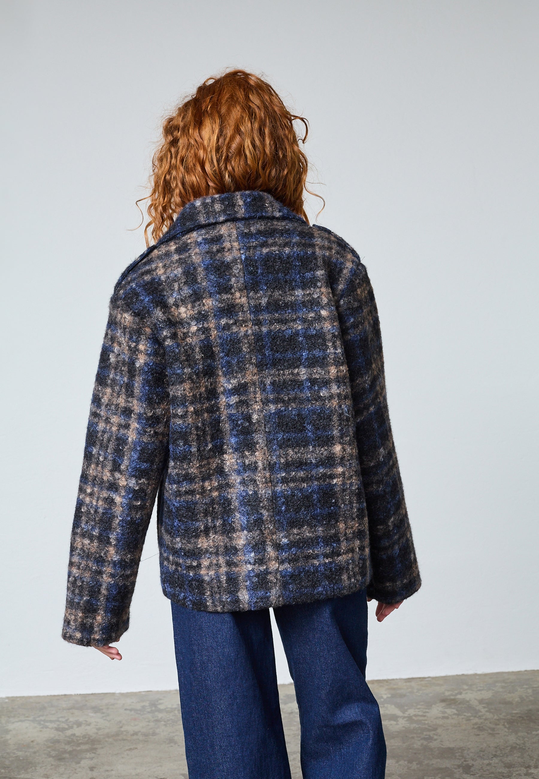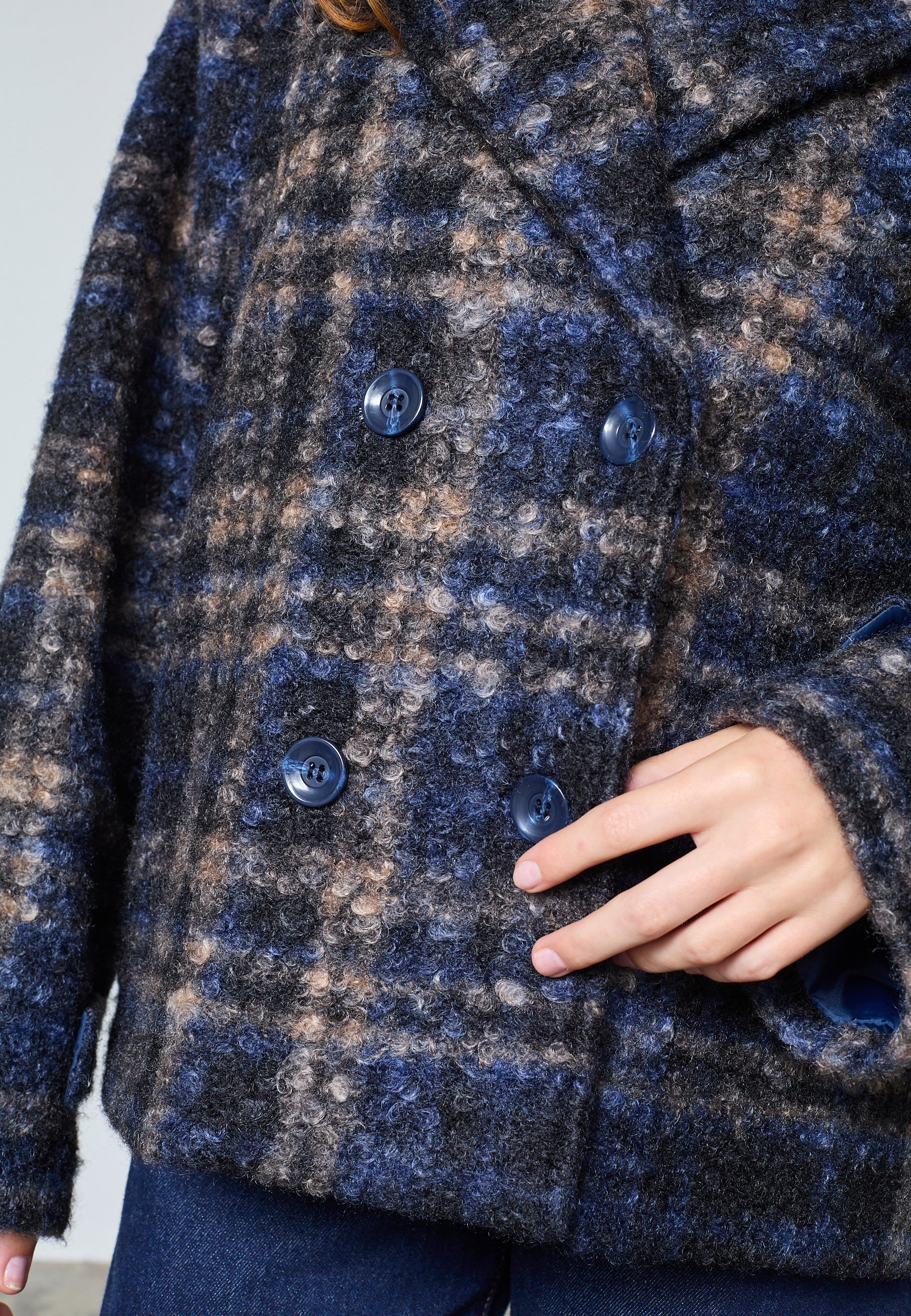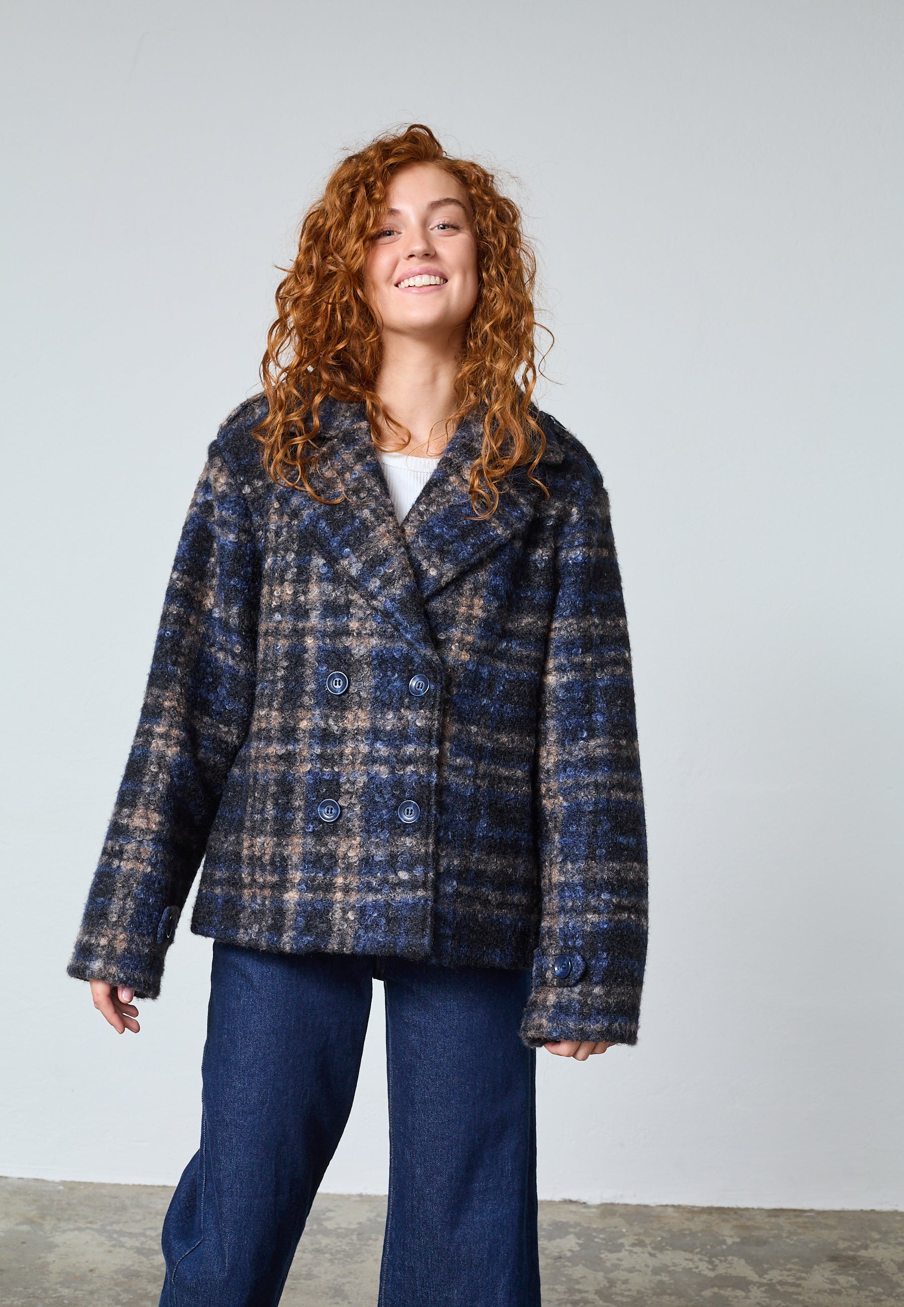 CALEB-NEW3 er en kort, dobbeltradet jakke med et ternet mønster. Den har store revers, en blød overflade og en afslappet pasform. Modellen har en str. S på.