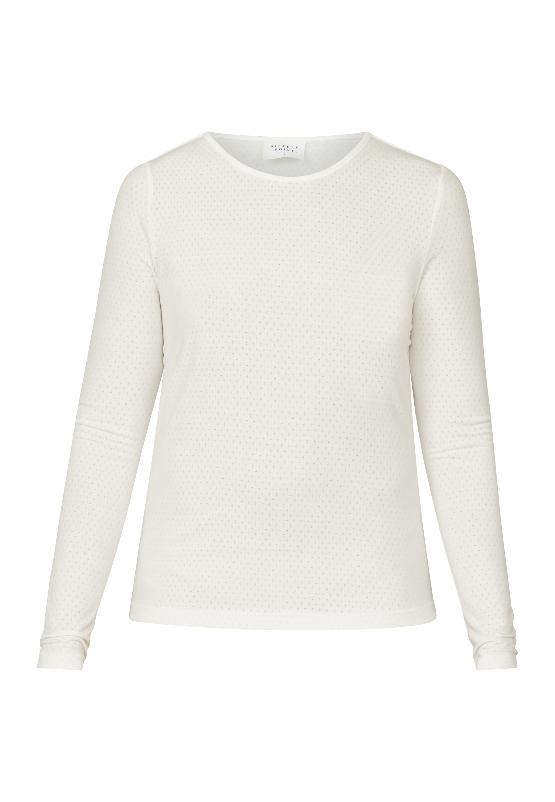 En hvid langærmet top med rund halsudskæring og diskret prikket mønster.