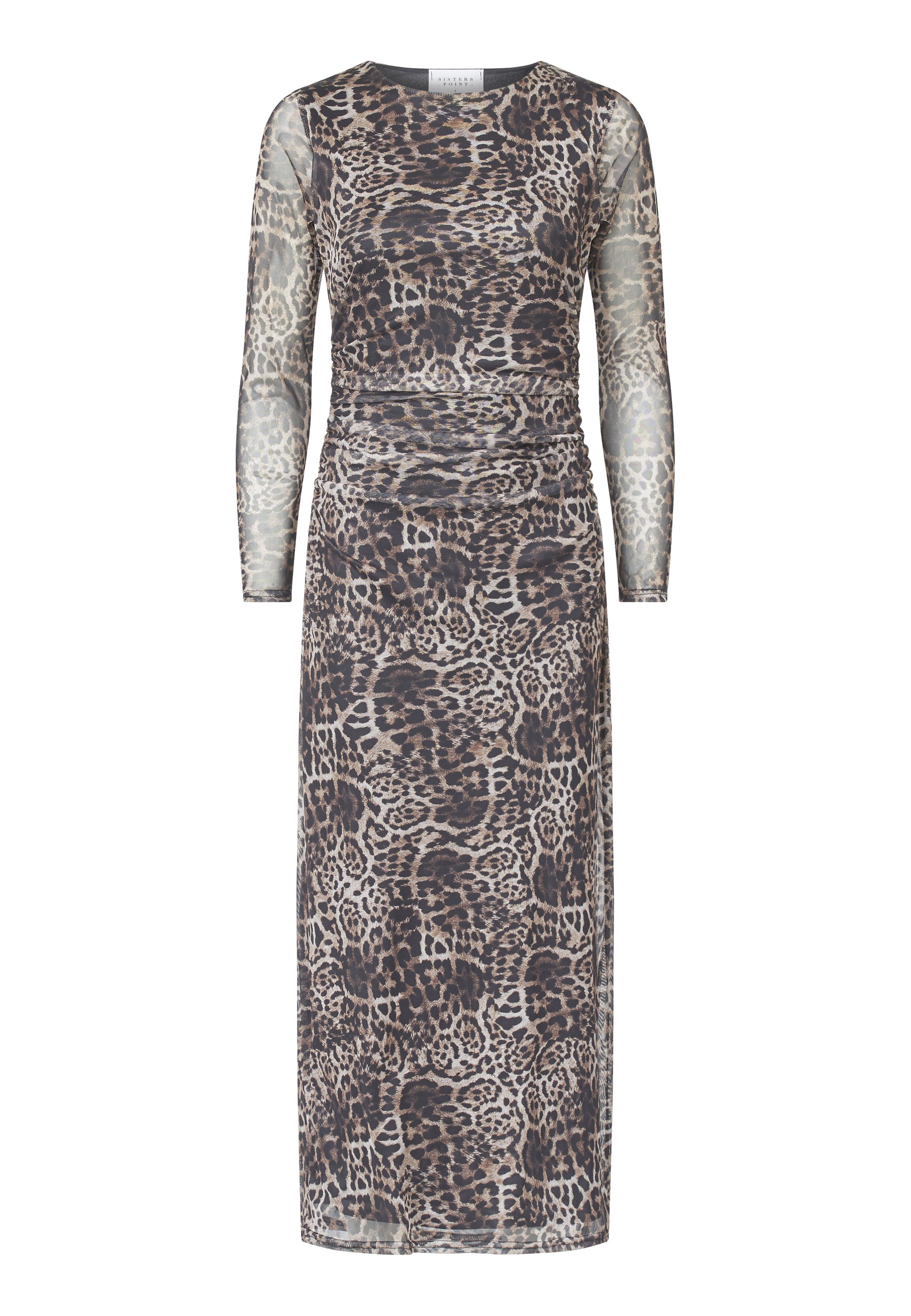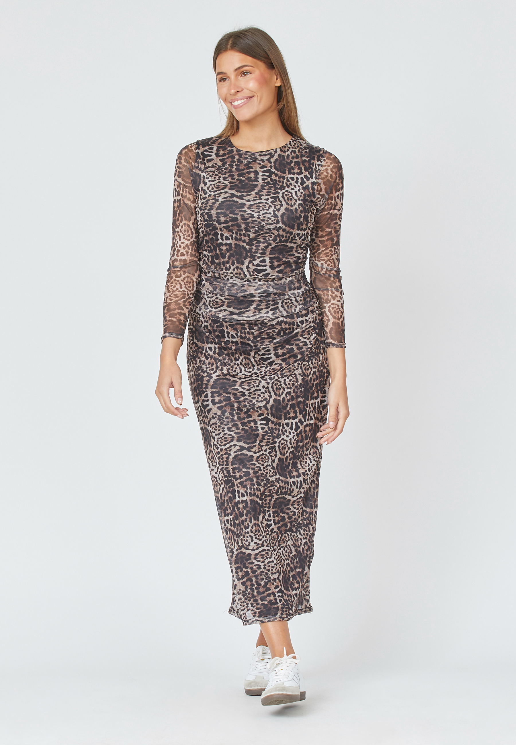 En cool leopard-print meshkjole med rynkedetalje ved taljen, der fremhæver en smuk, stramtsiddende silhuet. Kjolen har en påsyet underkjole, som sikrer, at den ikke er gennemsigtig, og giver et stilfuldt og selvsikkert look.