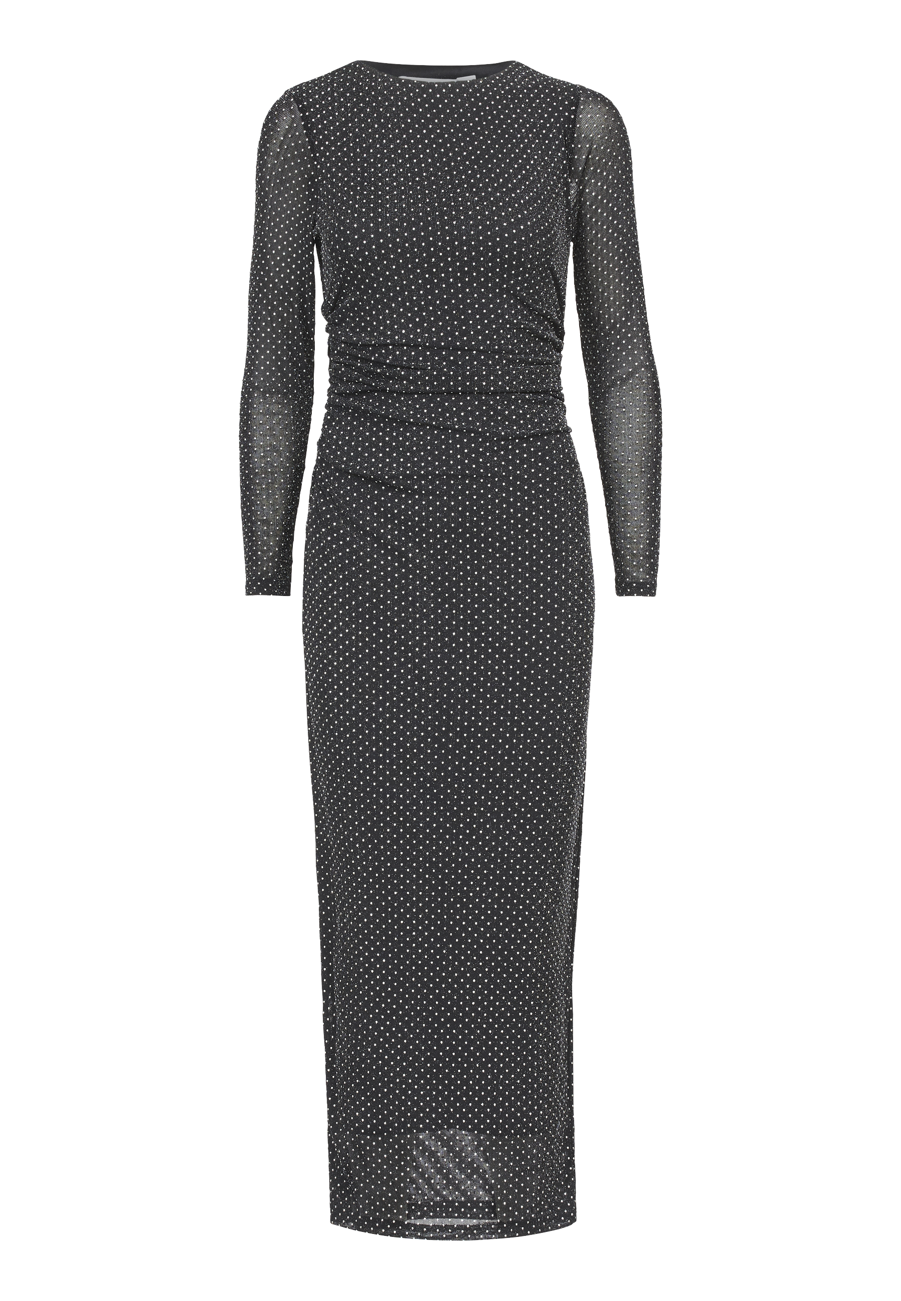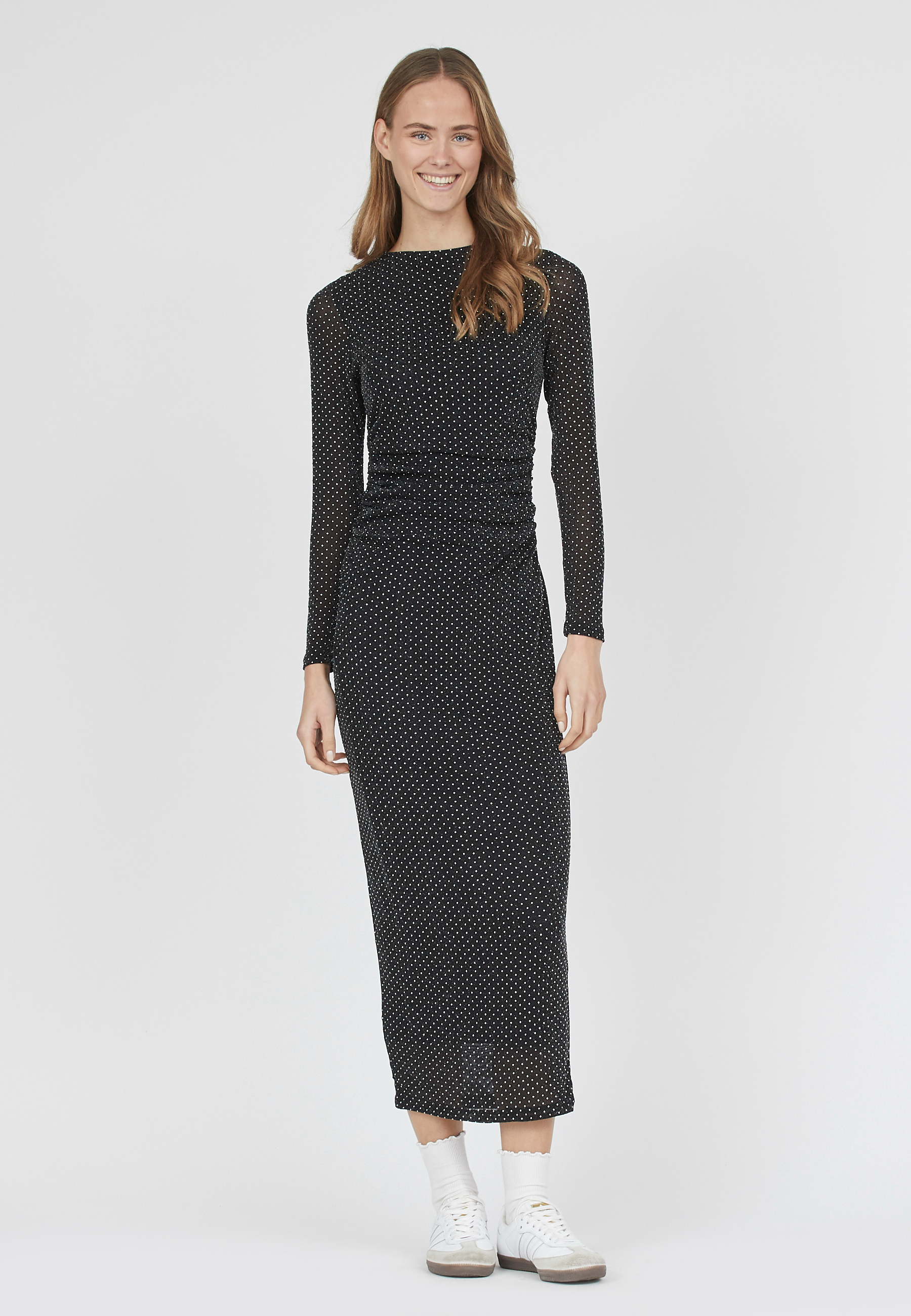 En festlig favorit, der kombinerer glimmer-effekt med et smukt mønster af små hvide prikker. Kjolen er designet med lange ærmer og har en blød underkjole, som sikrer en behagelig pasform hele aftenen. Perfekt til fester og arrangementer, hvor du ønsker at stråle med et elegant og moderne look.