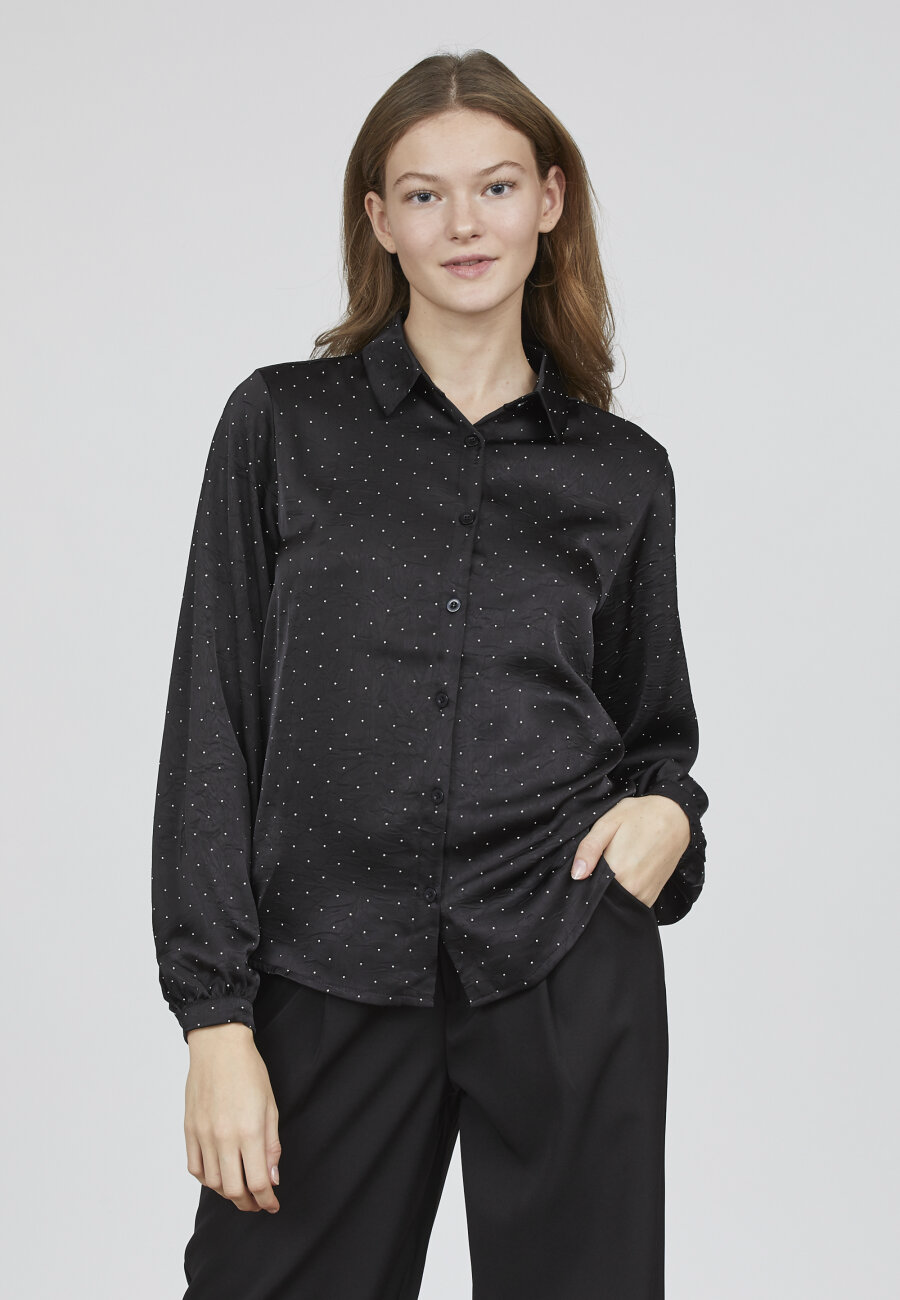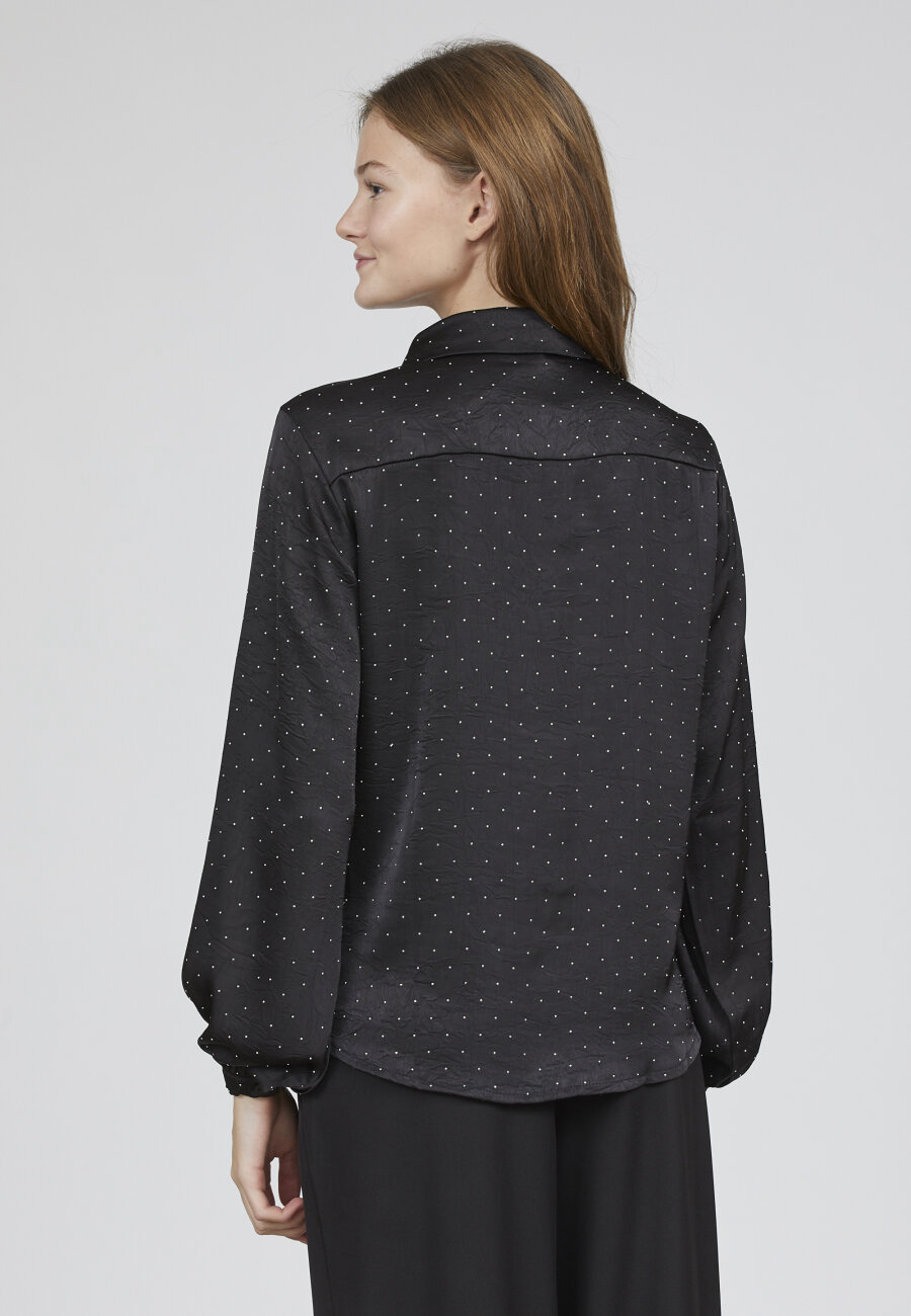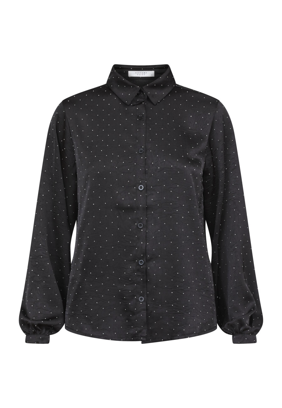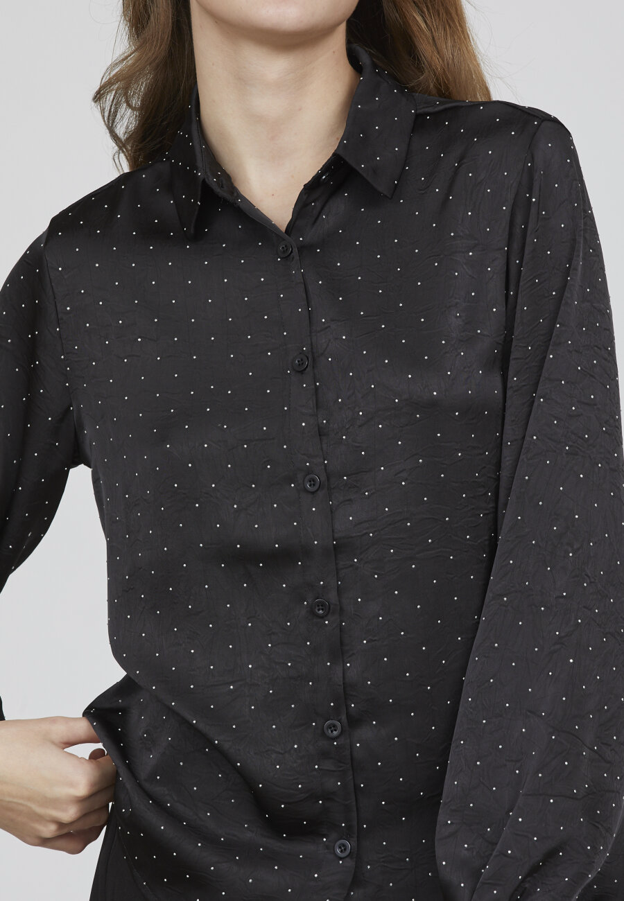 En feminim ensfarvet skjorte dekoreret med små similisten. Skjorten har en klassisk krave og knaplukning. Ærmerne er luftige og samlet i en kort manchet med knaplukning.