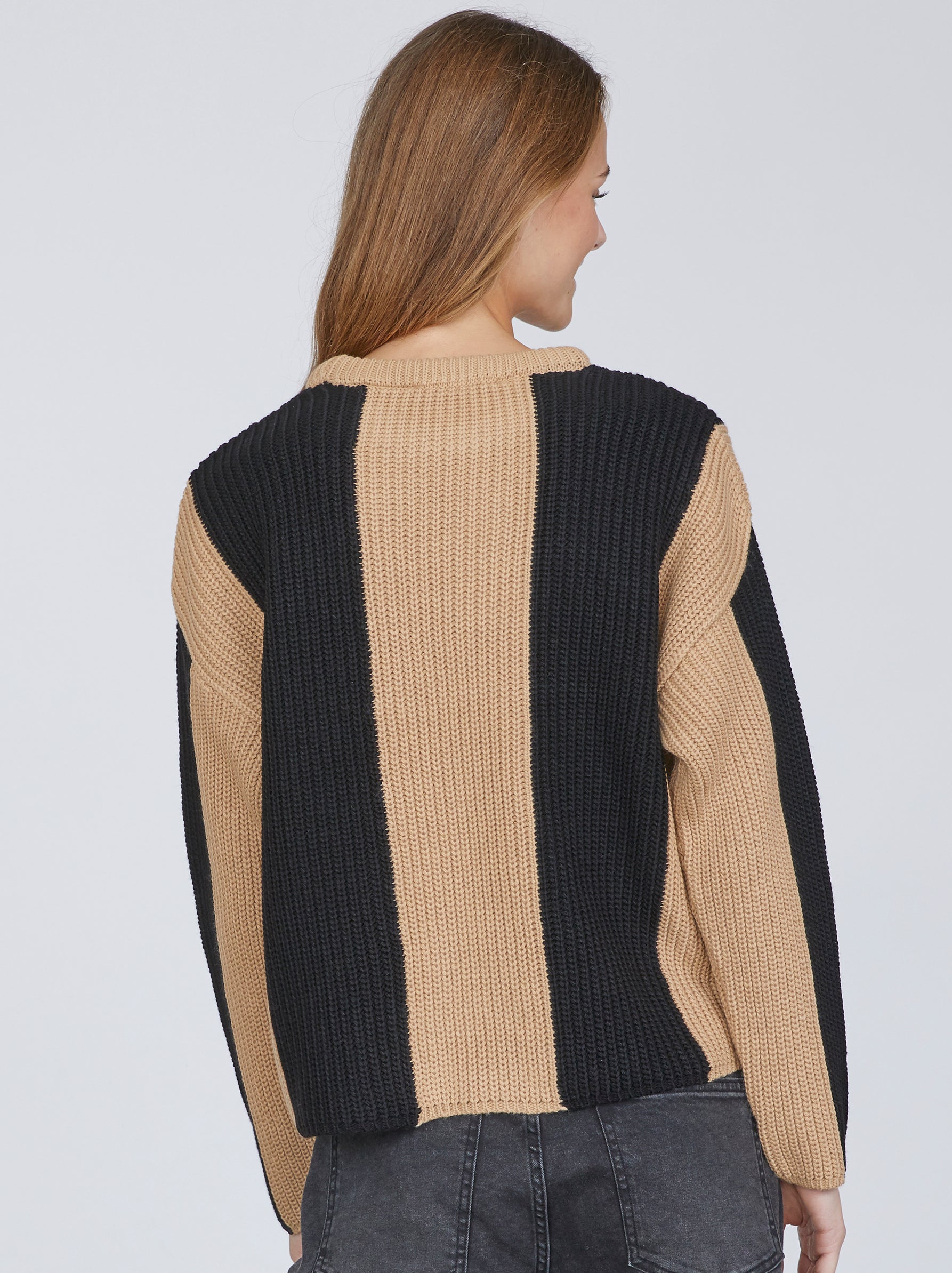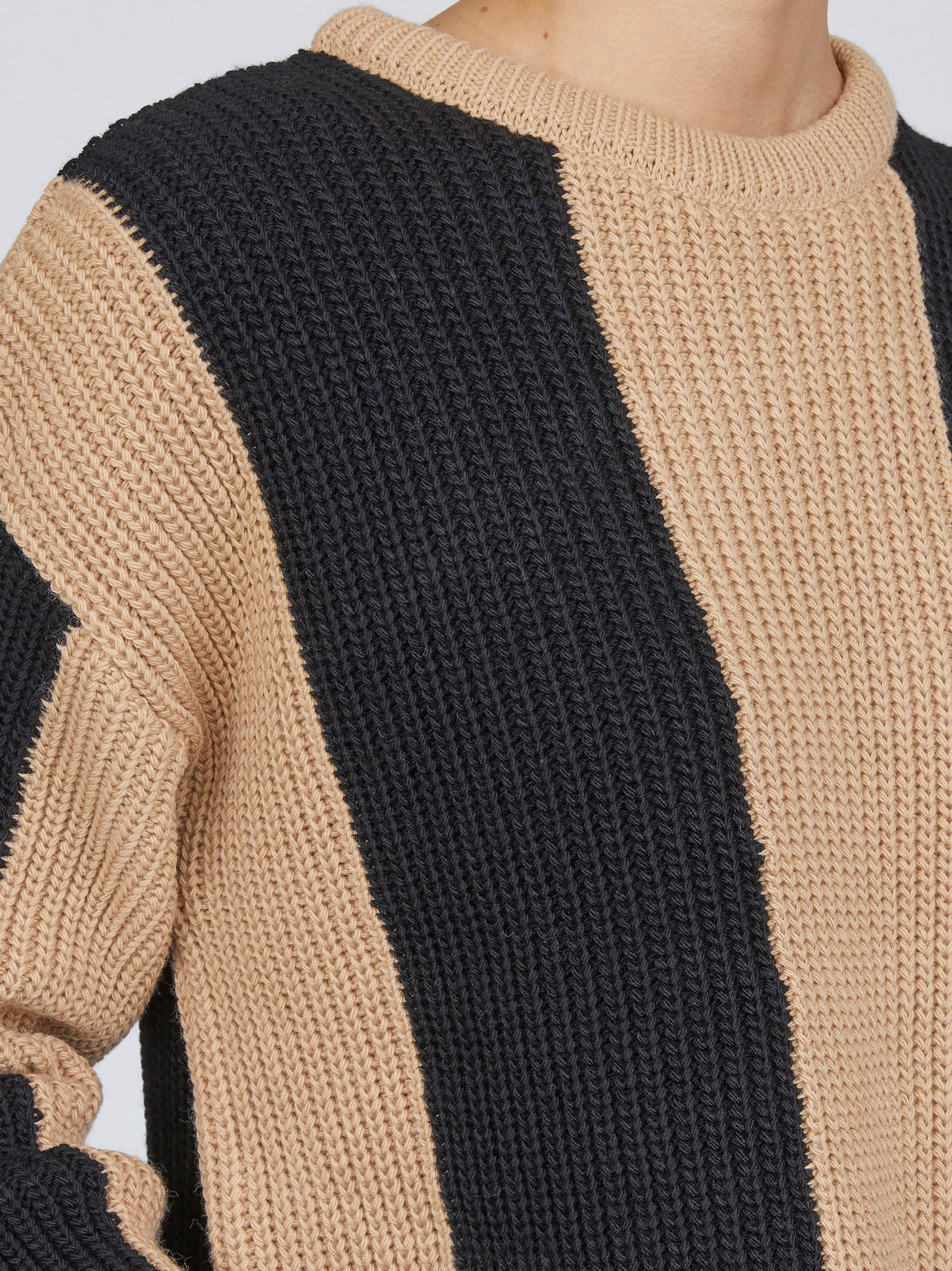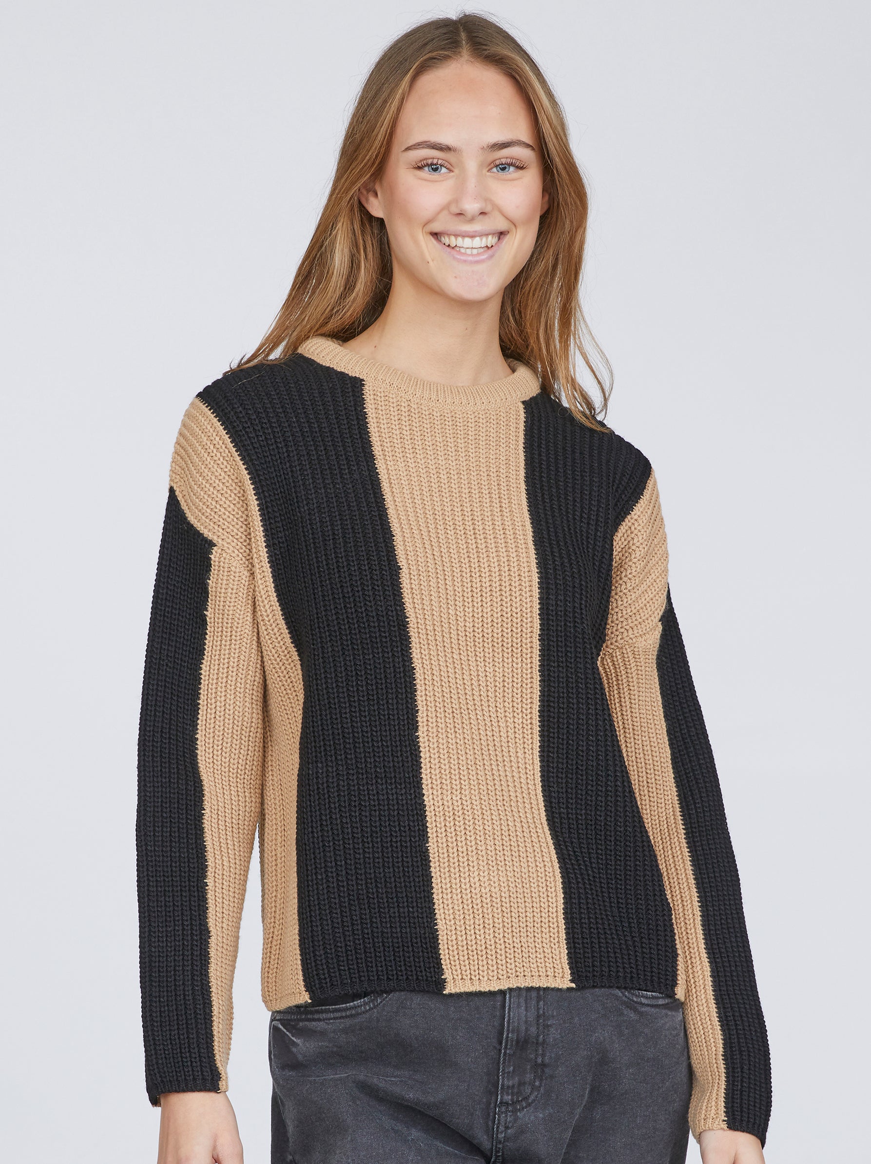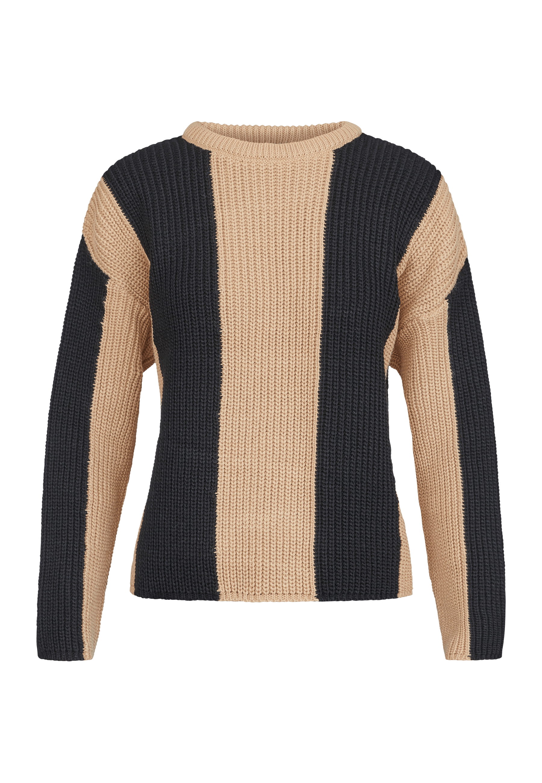 En behagelig strik med en ribkant ved halsen. Striktrøjen er detaljeret med brede striber.