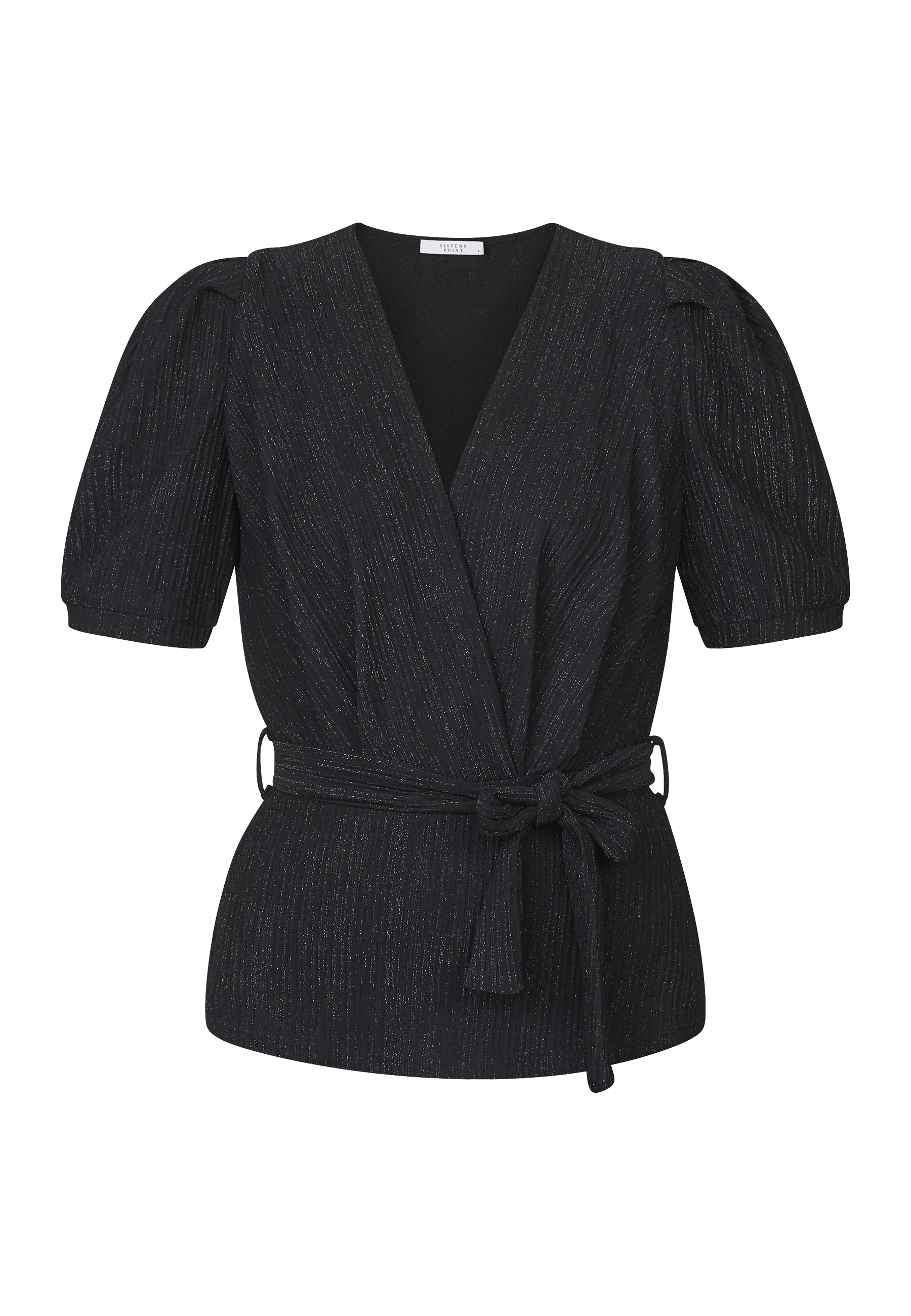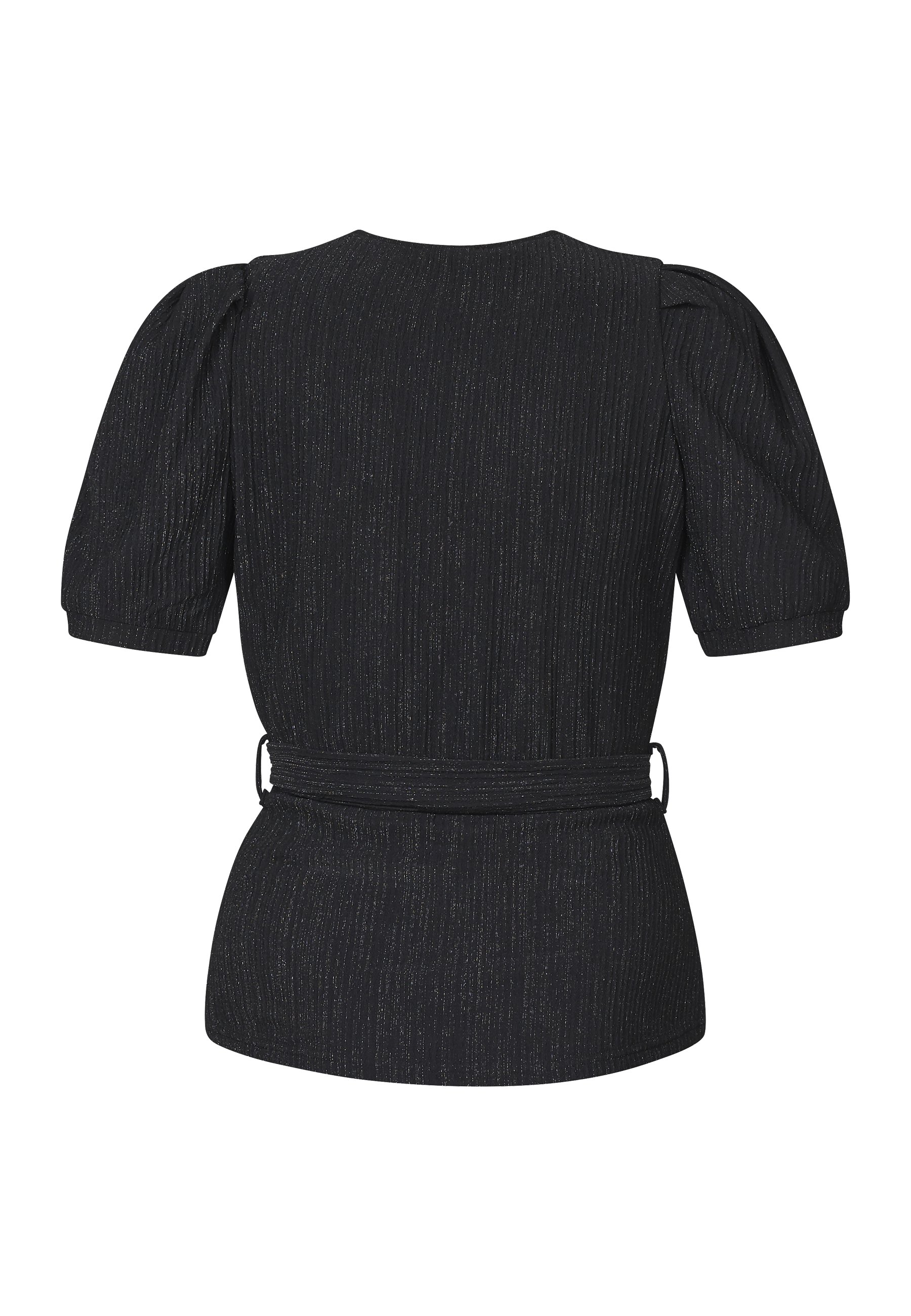 Bluse med korte ærmer, V-udskæring og bindebånd i livet. Glimmertråden gør den perfekt til både hverdag og fest.