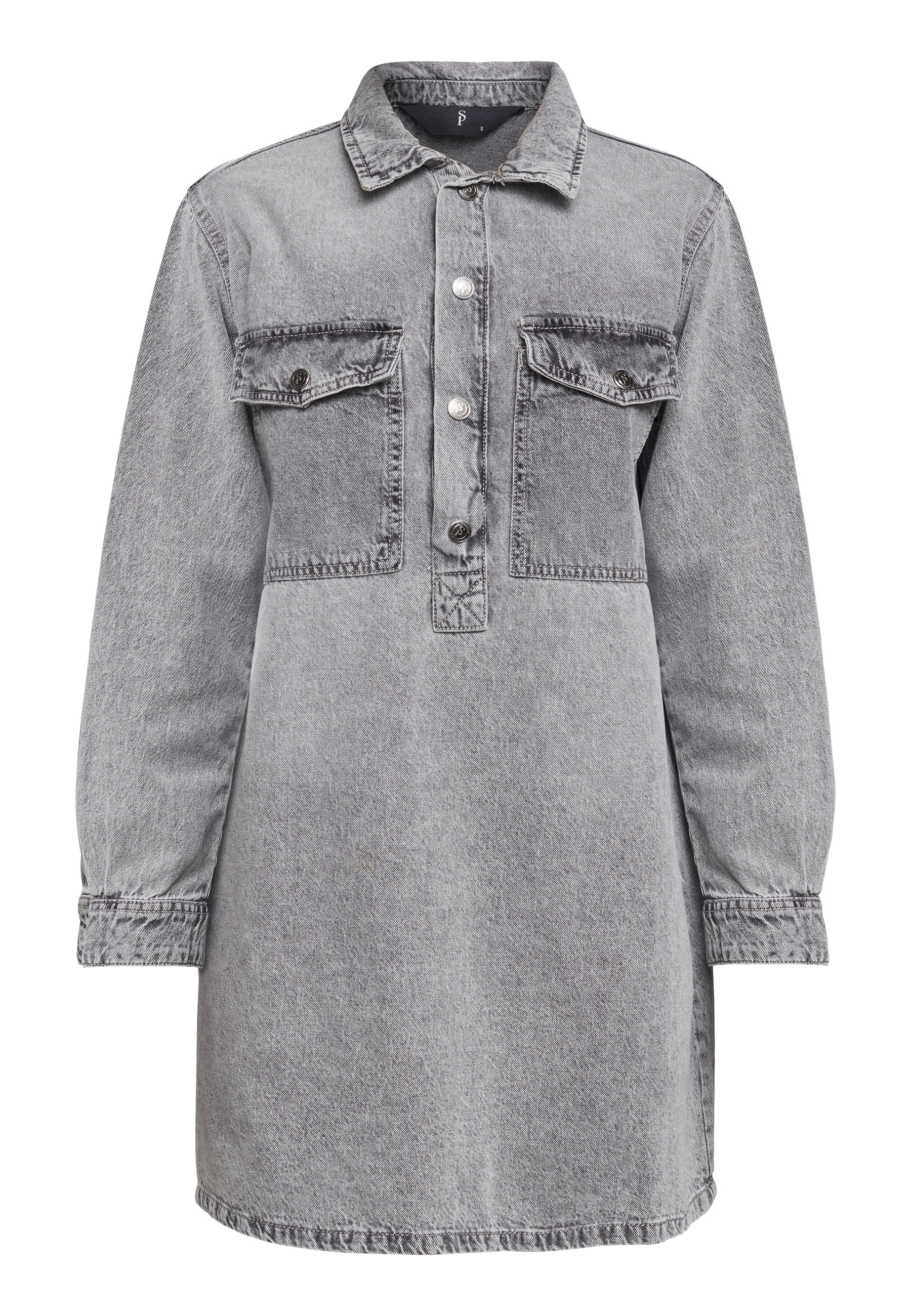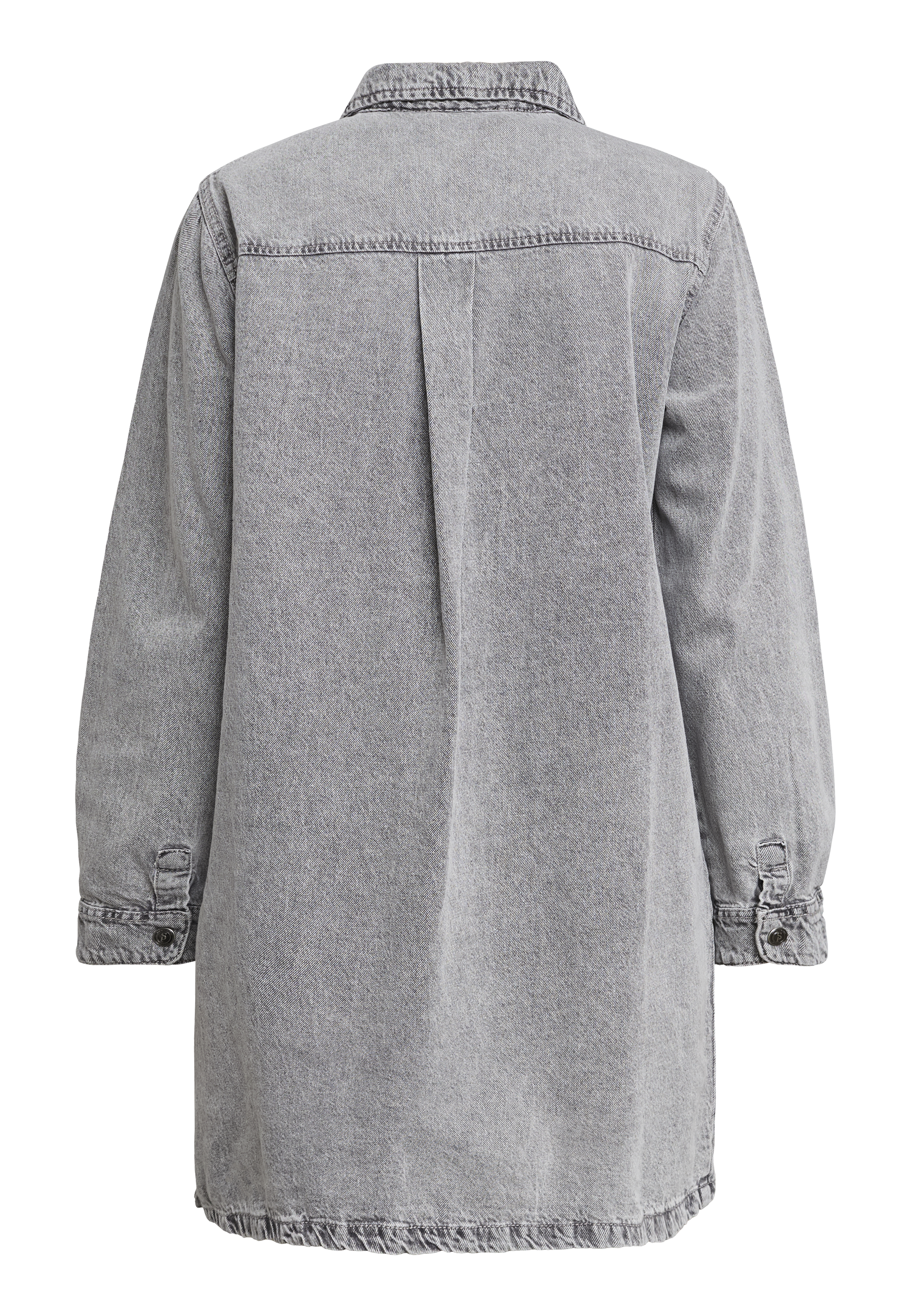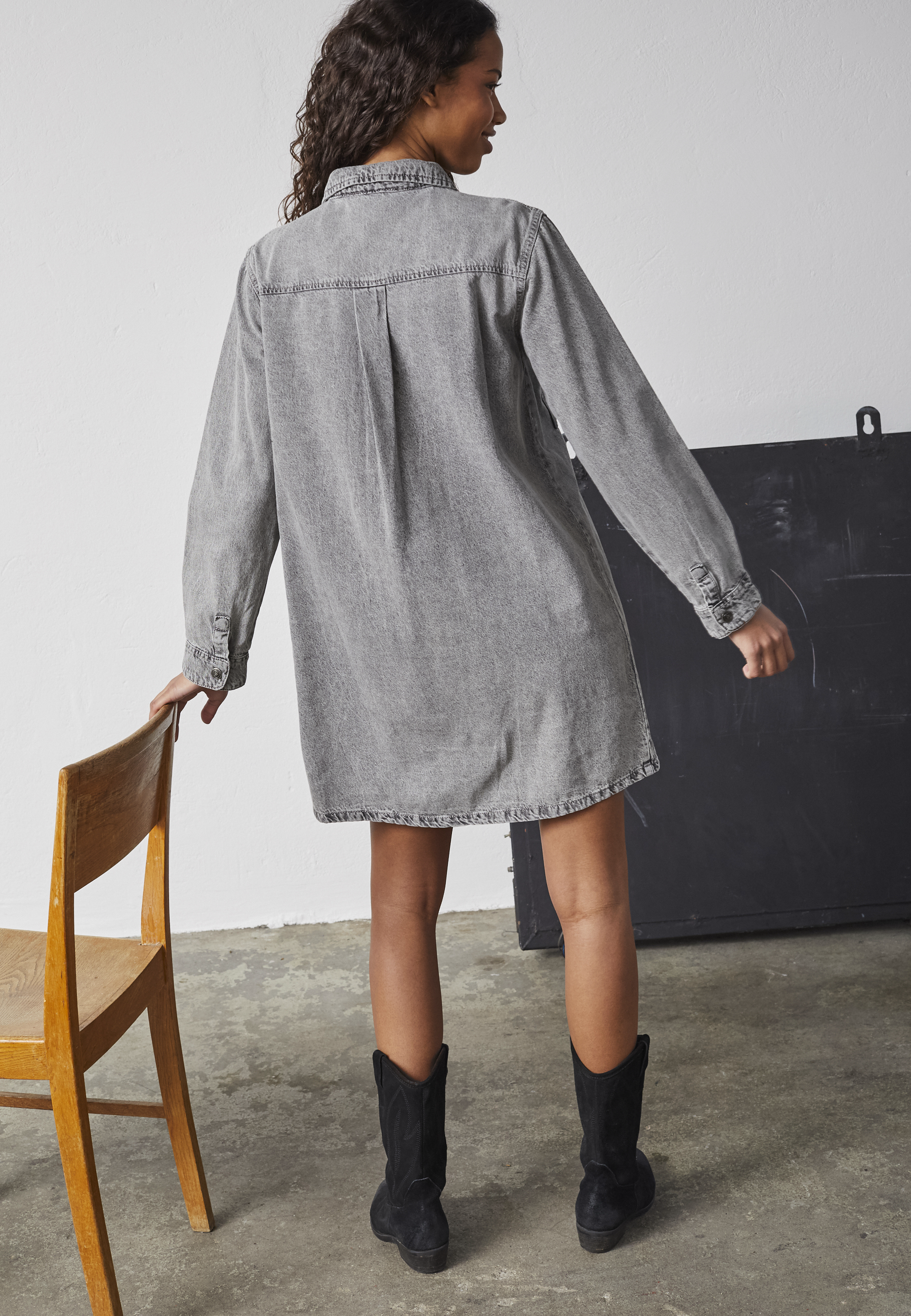 En cool denimkjole med lange ærmer, brystlommer og knaplukning. Perfekt til hverdagen med sneakers eller støvler, og nem at style op med smykker og fine sko til særlige anledninger.
