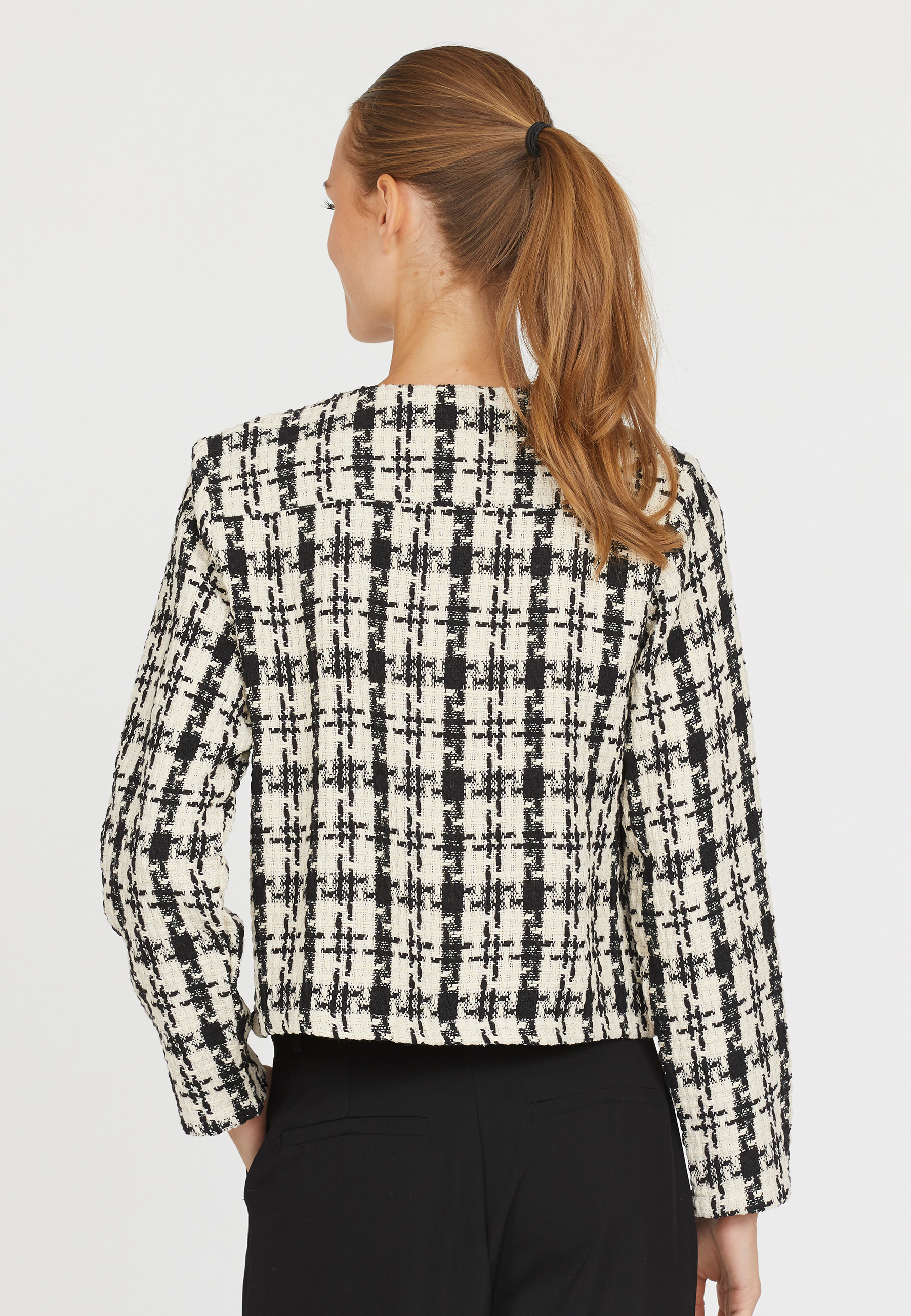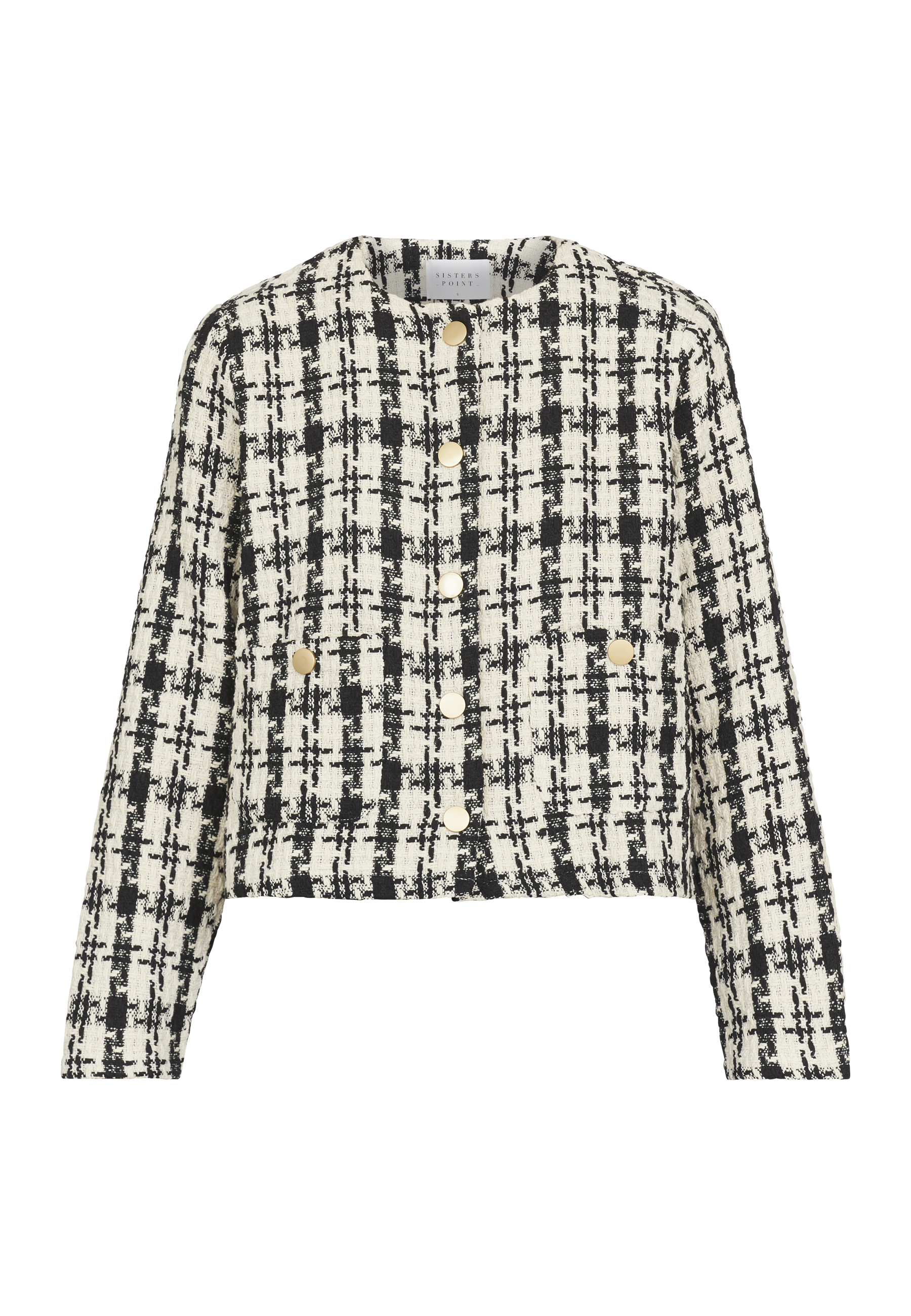 En ternet, sofistikeret og kraveløs jakke. Jakken har en normal pasform og er lavet i en forholdsvis let kvalitet, der gør den ideel at bruge uden på en top eller skjorte. Gennemknappet med guldfarvede trykknapper med let vatterede skuldre, samt påsyede lommer på fronten.