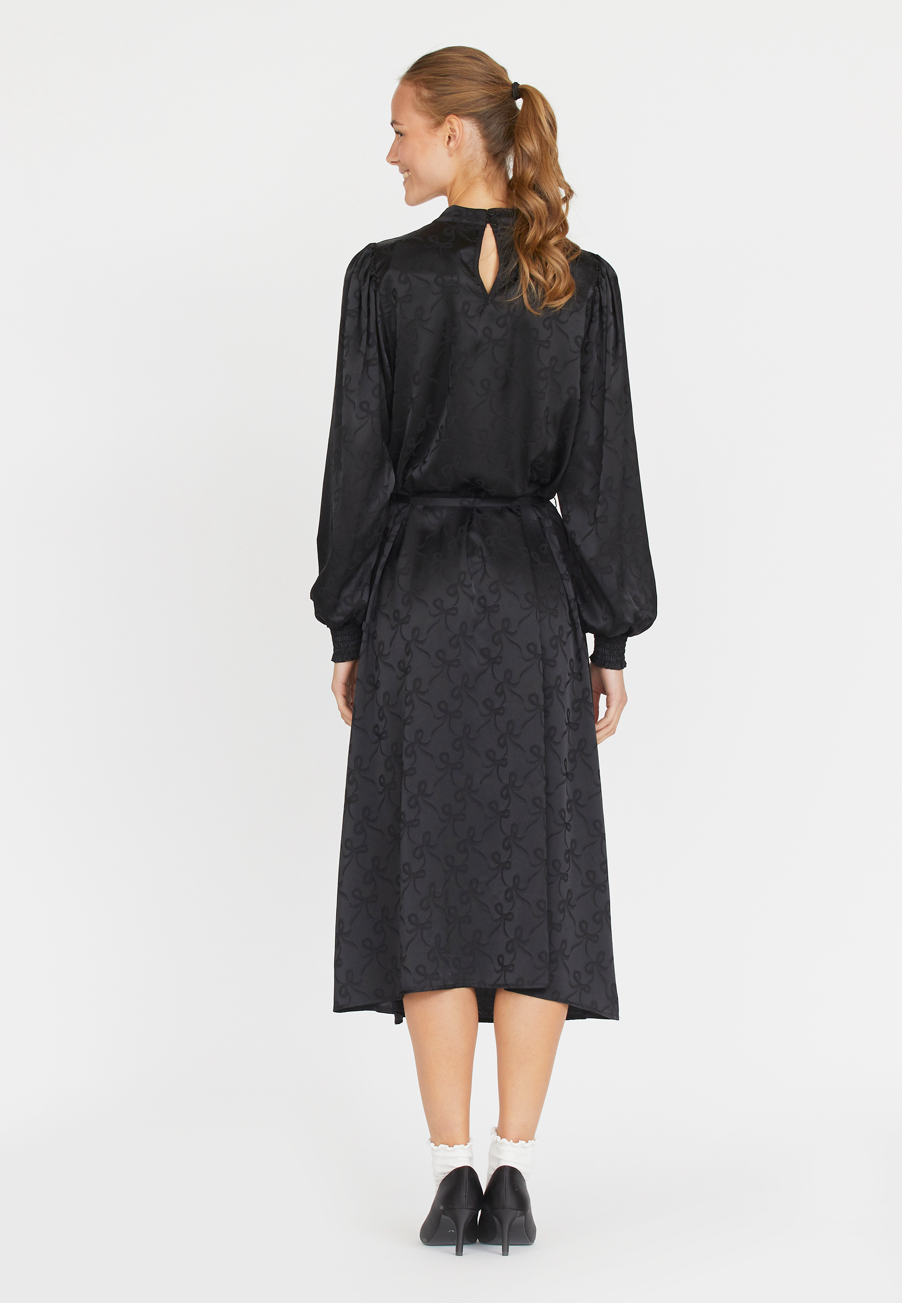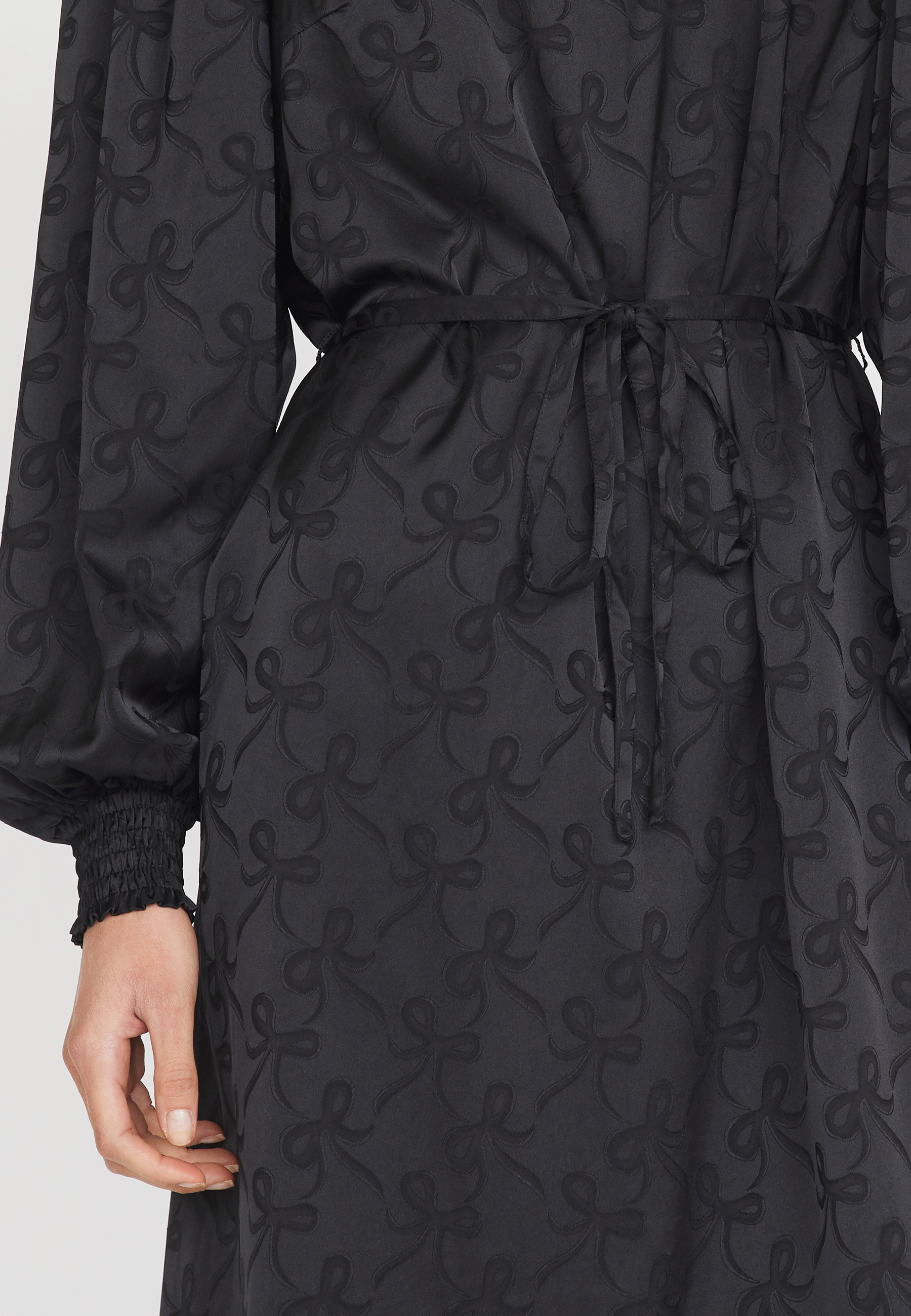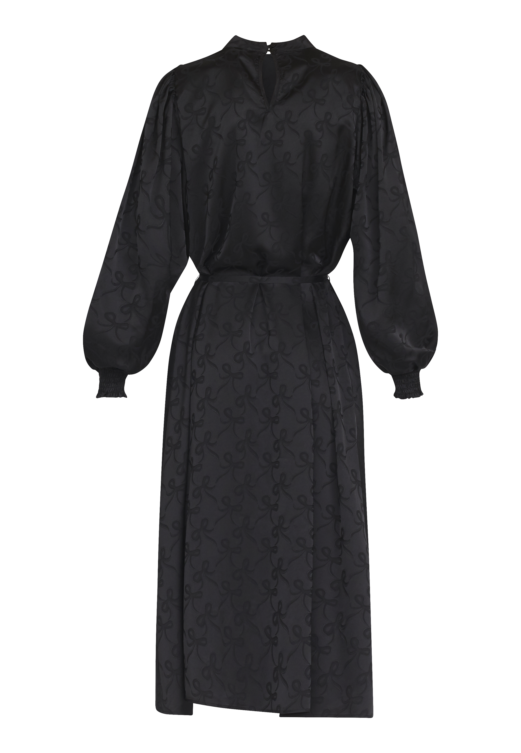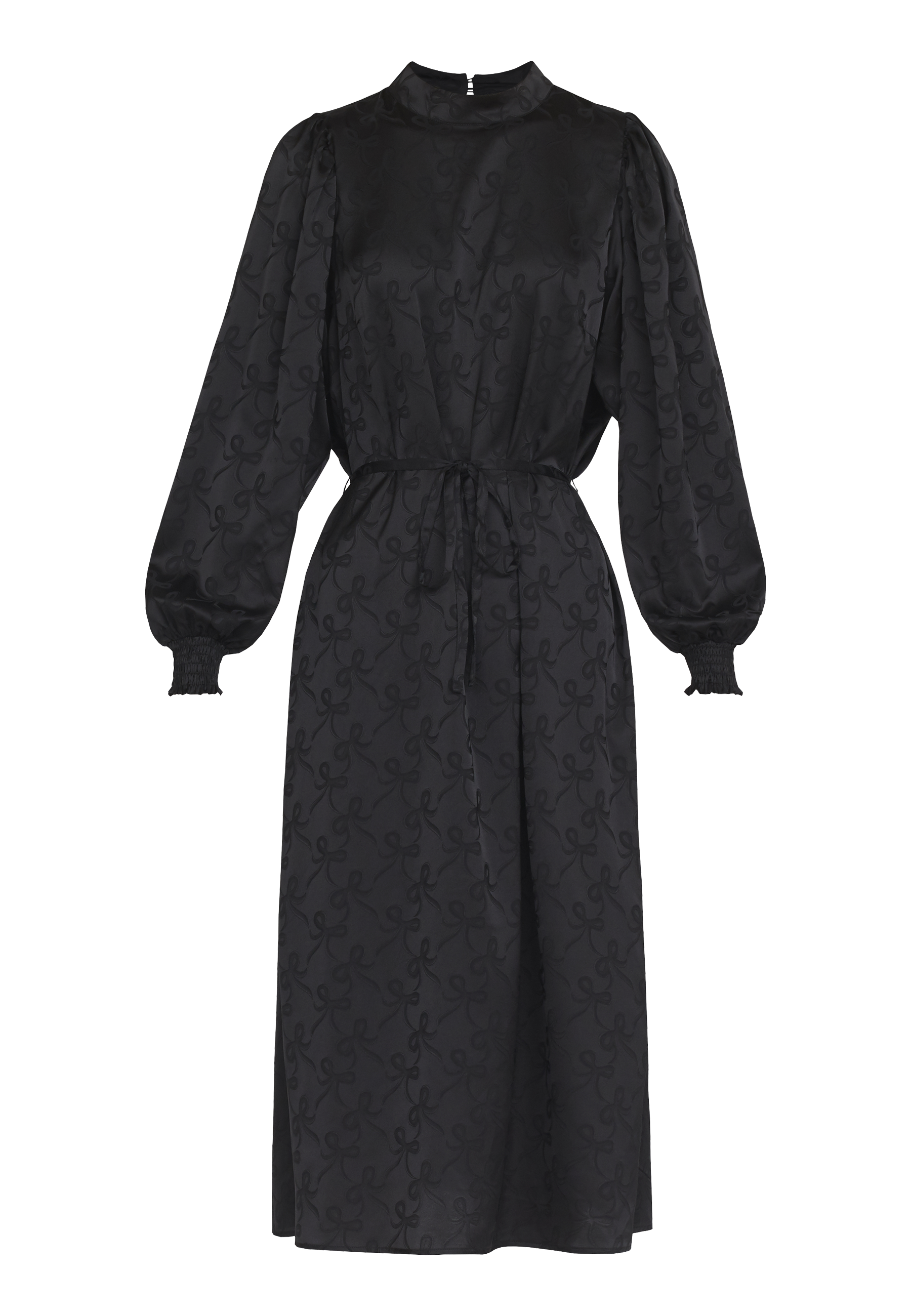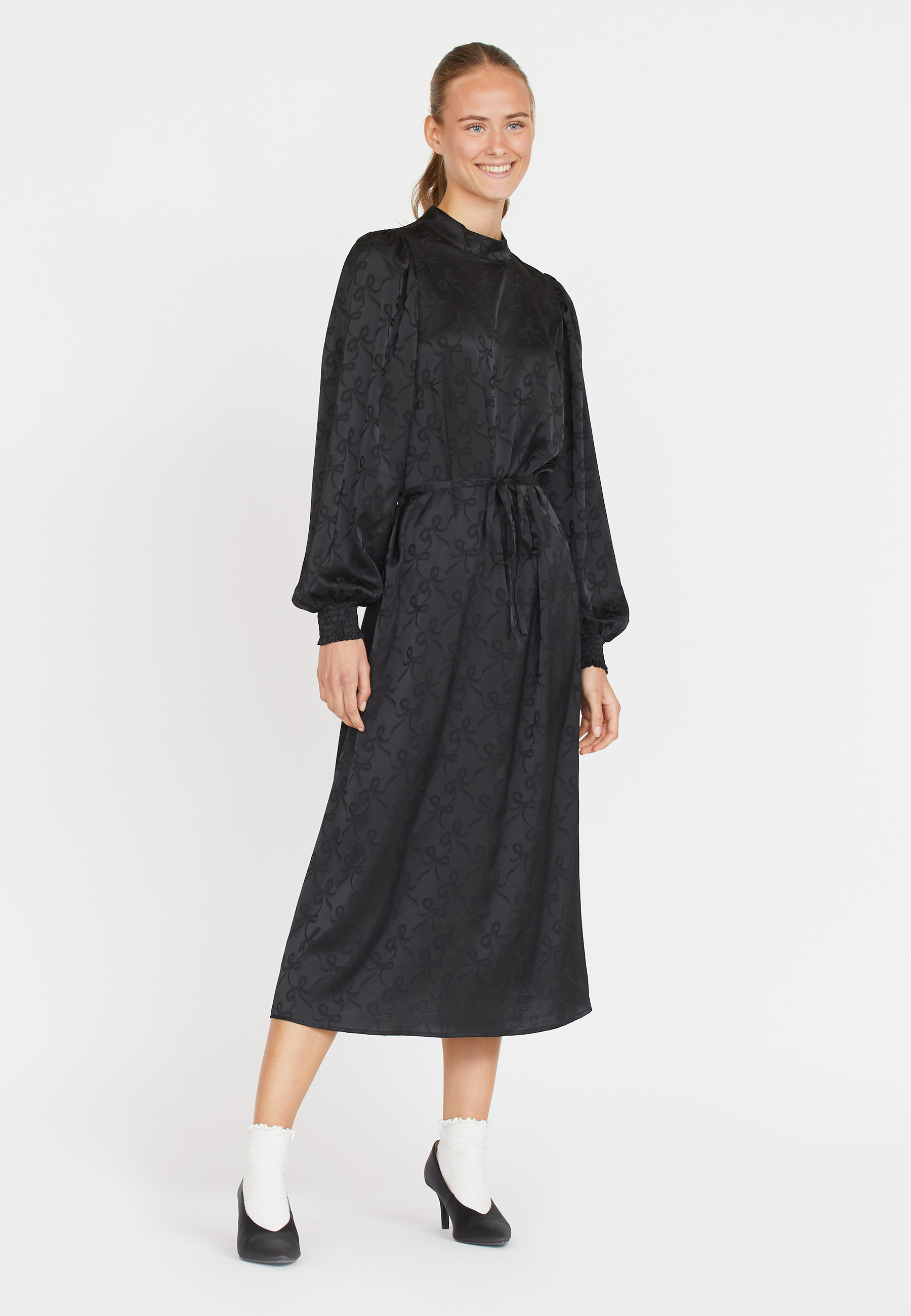 En lang kjole med sløjfe print og et aftageligt bælte i taljen. Kjolen har en smock kant ved hvert håndled og en rund hals, med en lille knappelukning i nakken.
