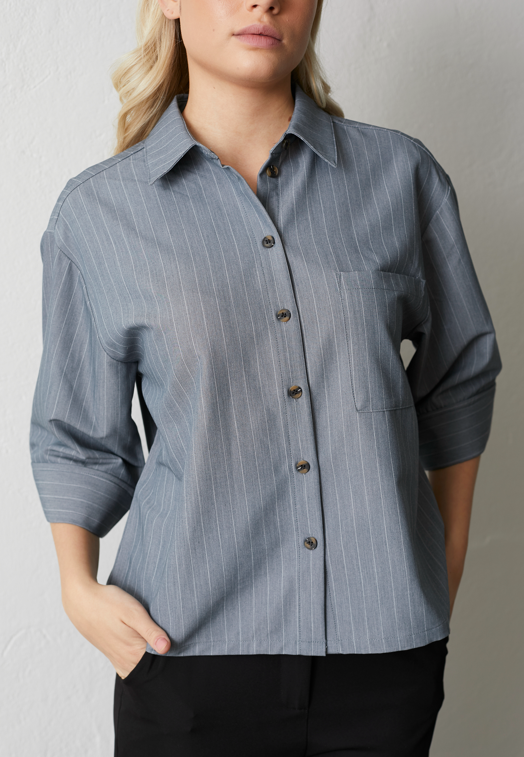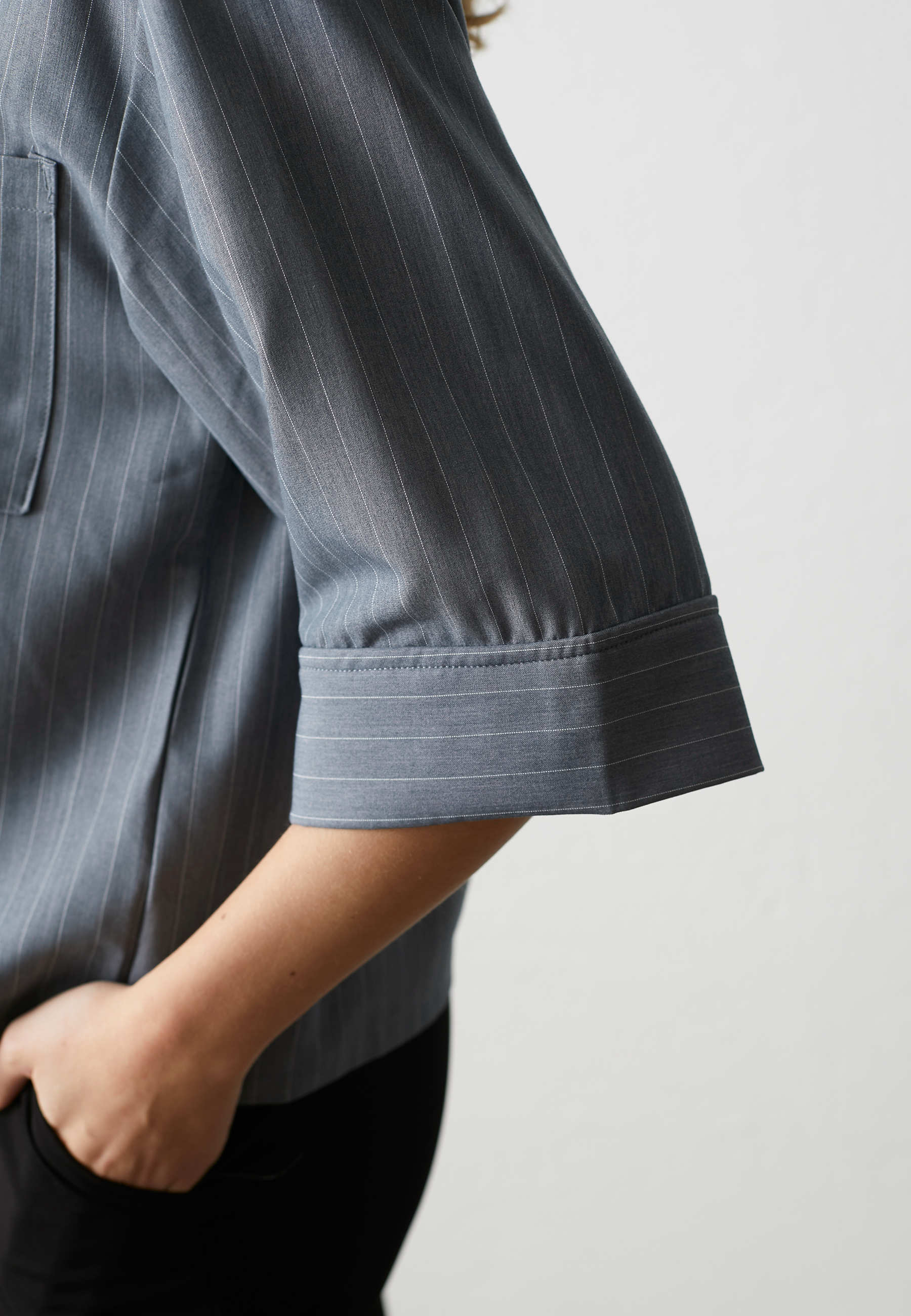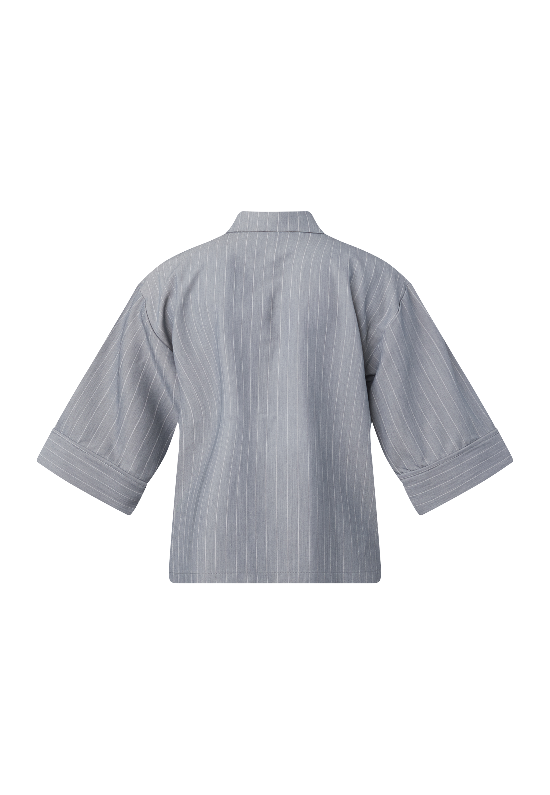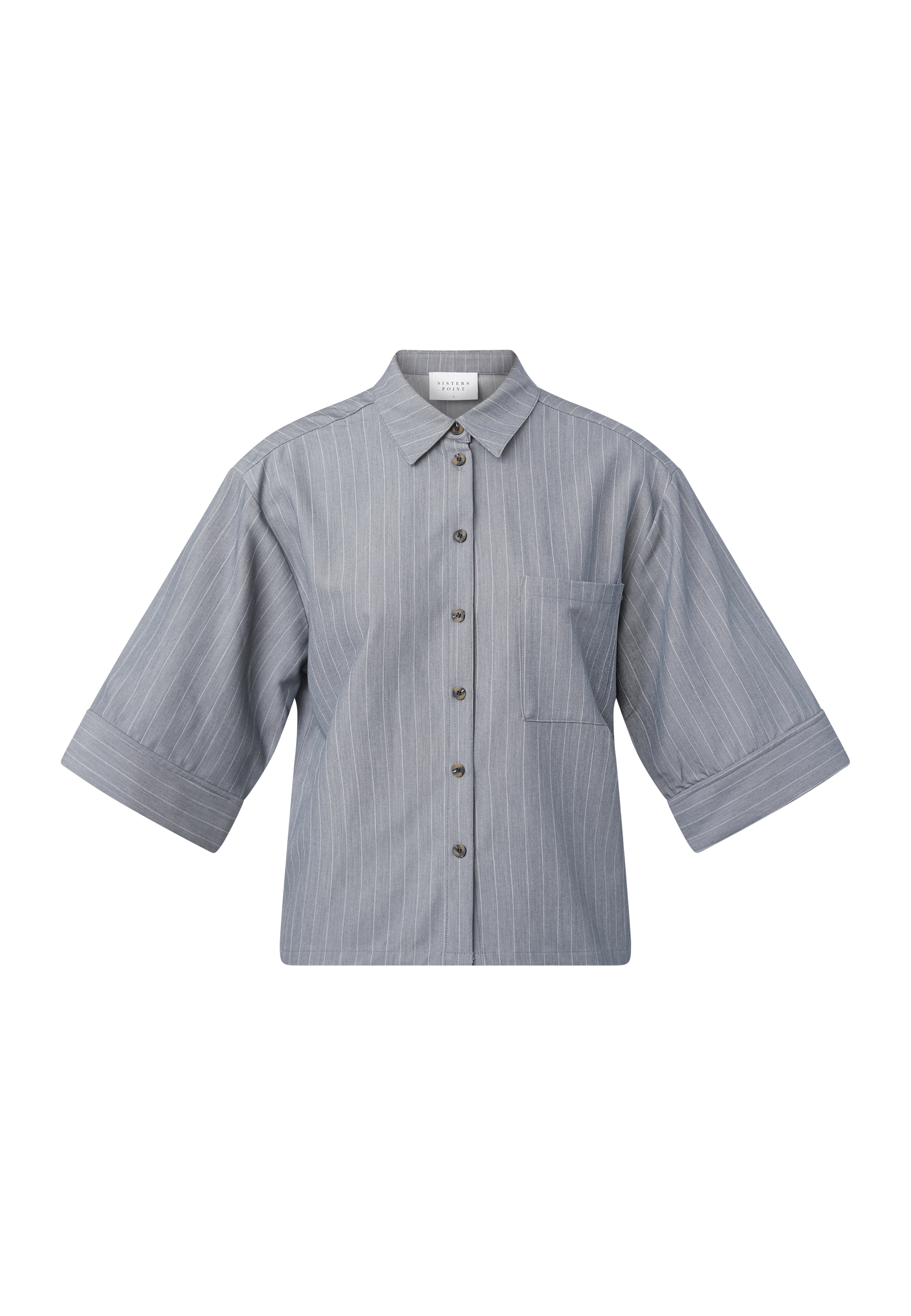 En kort ensfarvet skjorte med striber fra Sisters Point. Skjorten har løse og luftige trekvart ærmer, og en lomme på brystet. Skjorten har knaplukning og klassisk skjortekrave.