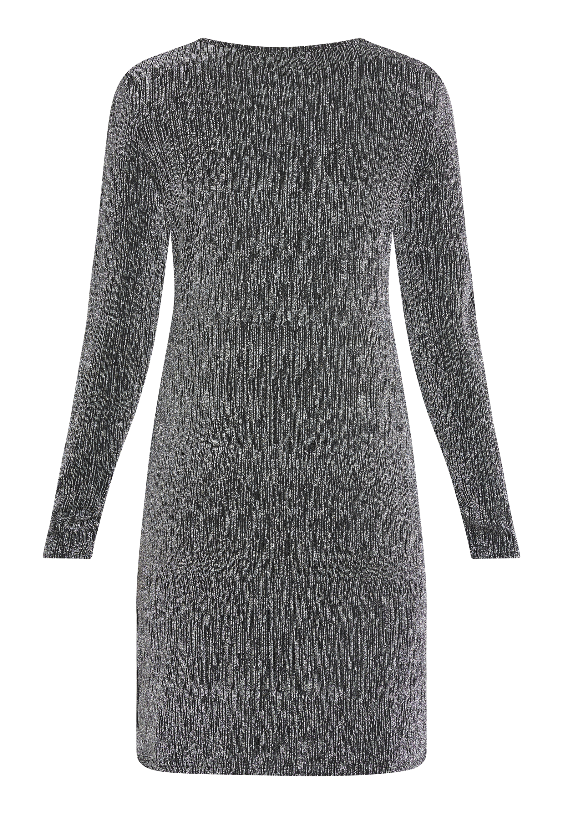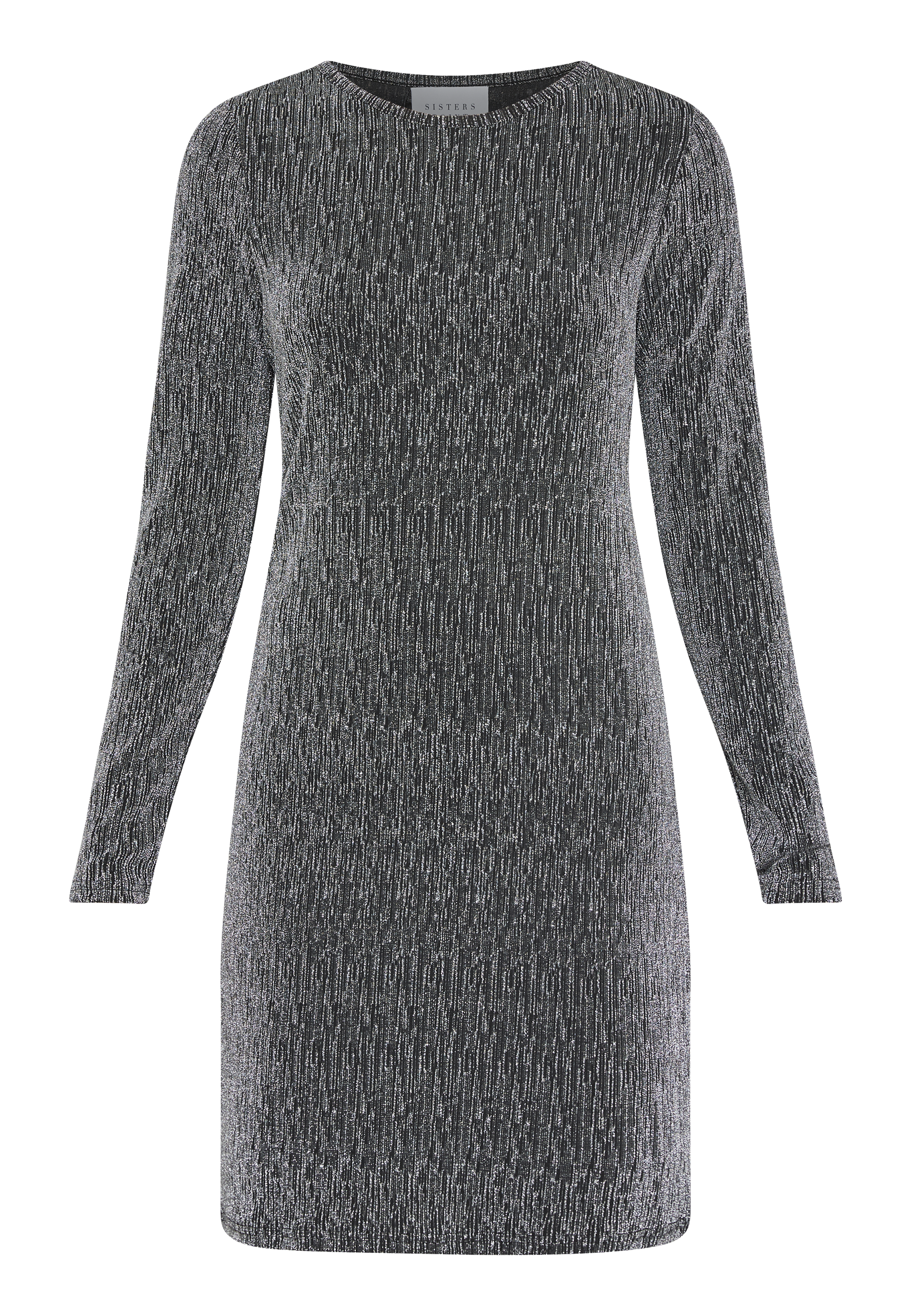 En virkelig fin og festlig kjole med lange ærmer og sølvfarvet glimmertråd. Kjolen er tætsiddende og tro mod størrelsen.